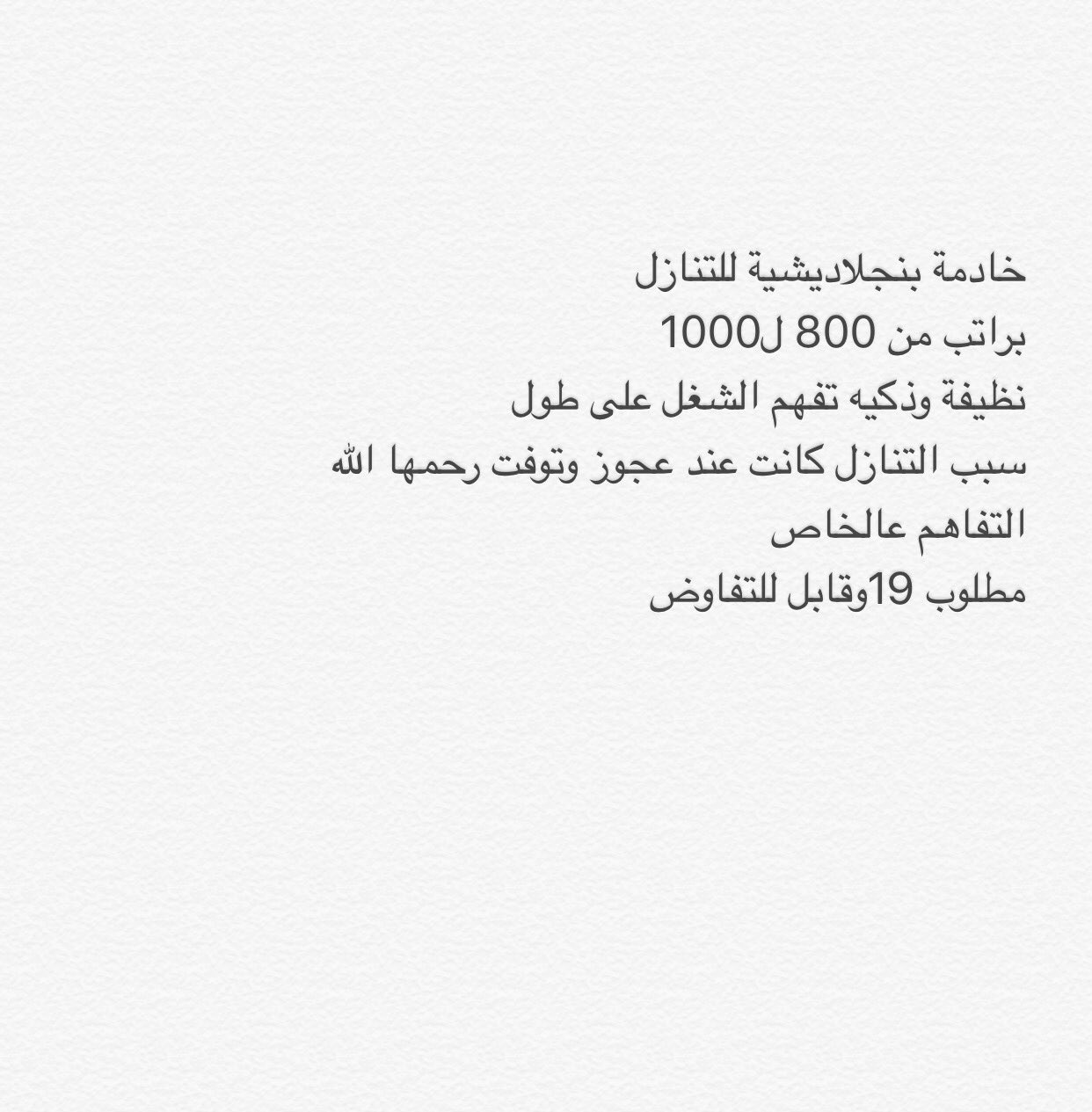 مربية أطفال من الفلبين. يجب القيام بتسديد كافة الرسوم المطلوبة لعملية نقل كفالة خادمة وهي تقدر بحوالي 2000 ريال سعودي في أول عملية نقل كفالة أما رسوم عملية النقل الثانية فهي تقدر بحوالي 4000 ريال سعودي أما العملية الثالثة فالرسوم حوالي 6000. المشاركة الأصلية كتبت بواسطة اذكروا الله. خادمة من اثيوبيا.