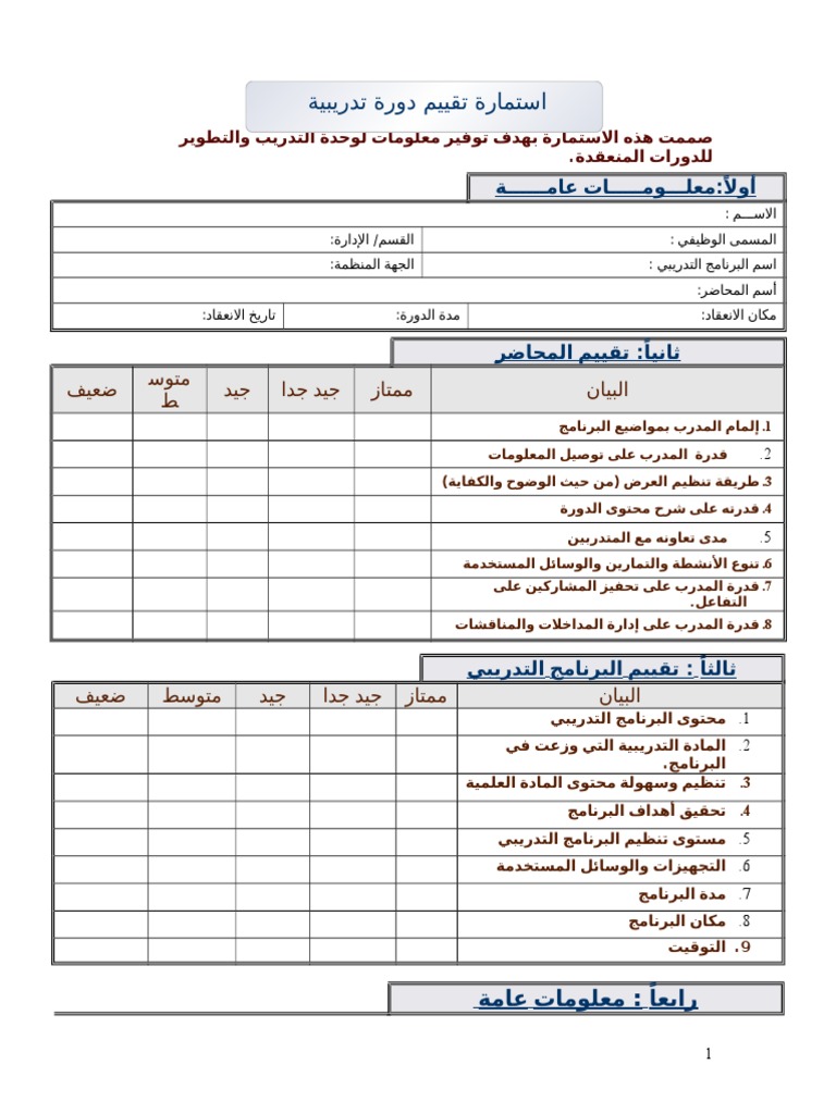 نموذج تقييم دورة تدريبية word. انت الآن في صفحة التحميل المجاني يمكنك من خلال هذه الصفحة تحميل ملف نموذج تقييم دورة تدريبية doc وهذا الملف هو أحد الملفات المرفقة في موضوع رد. تدريب الم در بين حيث قدر لهذا المؤشر عشر درجات برصد درجتين لكل دورة تدريبي ة في الحد الأعلى خمس دورات تدريبي ة في مجال. وقد اعطي هذا العنصر عشر درجات في نموذج. Thank you for helping us keep this platform clean.