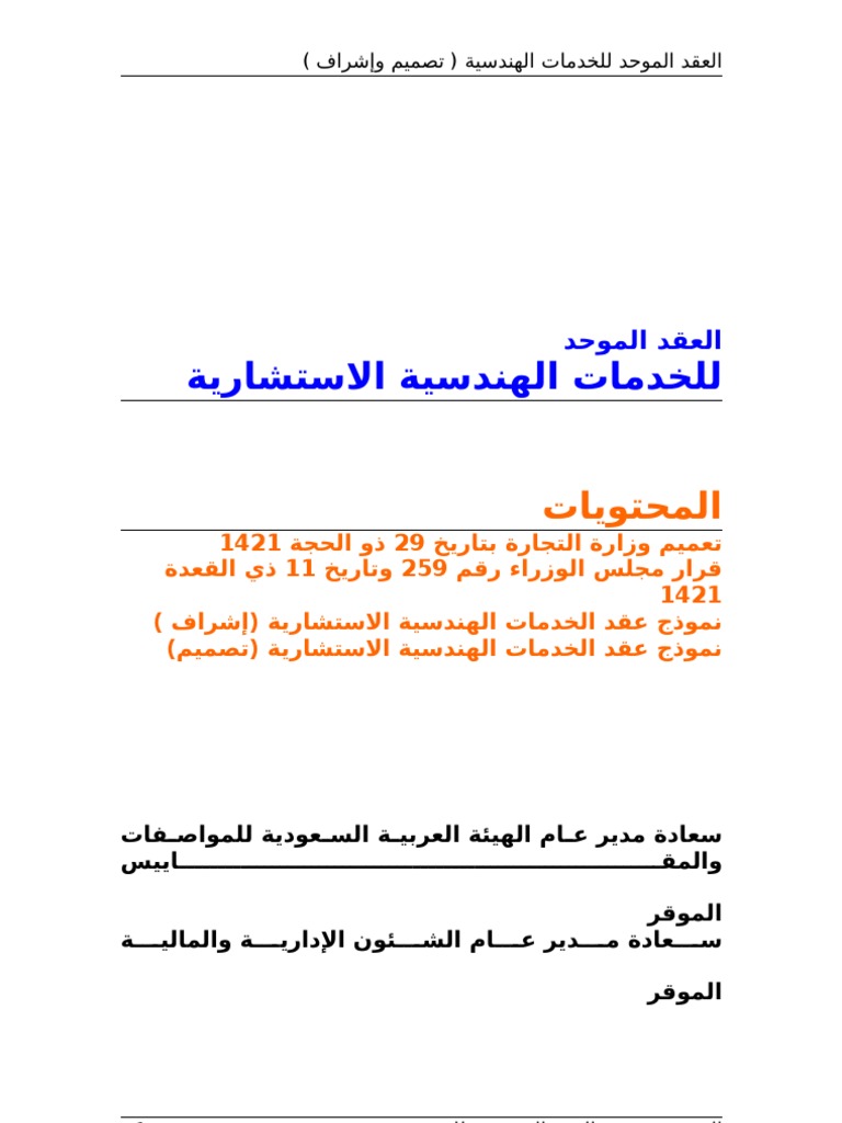 قرار مجلس الوزراء رقم 259 وتاريخ 11 ذي القعدة 1421 نموذج عقد الخدمات الهندسية الستشارية.